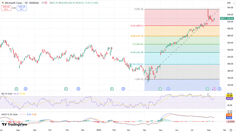 微软本季度财报表现亮眼,云服务以及Microsoft Copilot成为公司业绩增长的两大引擎。日线图看,股价触及555美元历史高位后小幅回调,出现部分获利了结迹象。技术面看,RSI信号线依旧位于50-70多头区间,MACD量能柱正由空转正,该信号意味着股价后市仍具备上行动力。2025年为AI应用元年,AI将更多体现在商业应用中,微软作为AI应用的领军者,其股价仍具备上涨潜力。8、9两月为美股季节性表现最差的两个月,交易者可等待近期回调入场的机会,后市关注斐波那契潜在回调位508,479以及455美金。